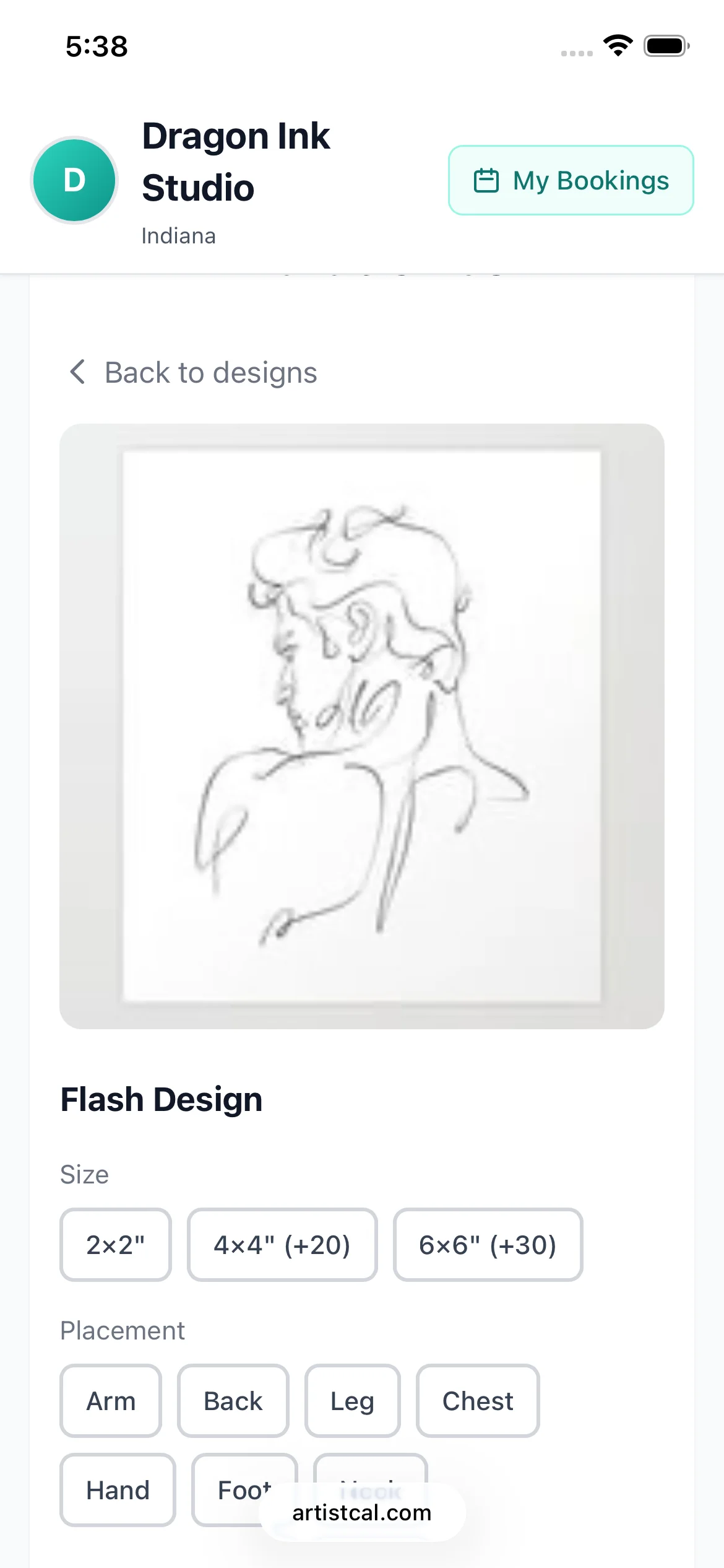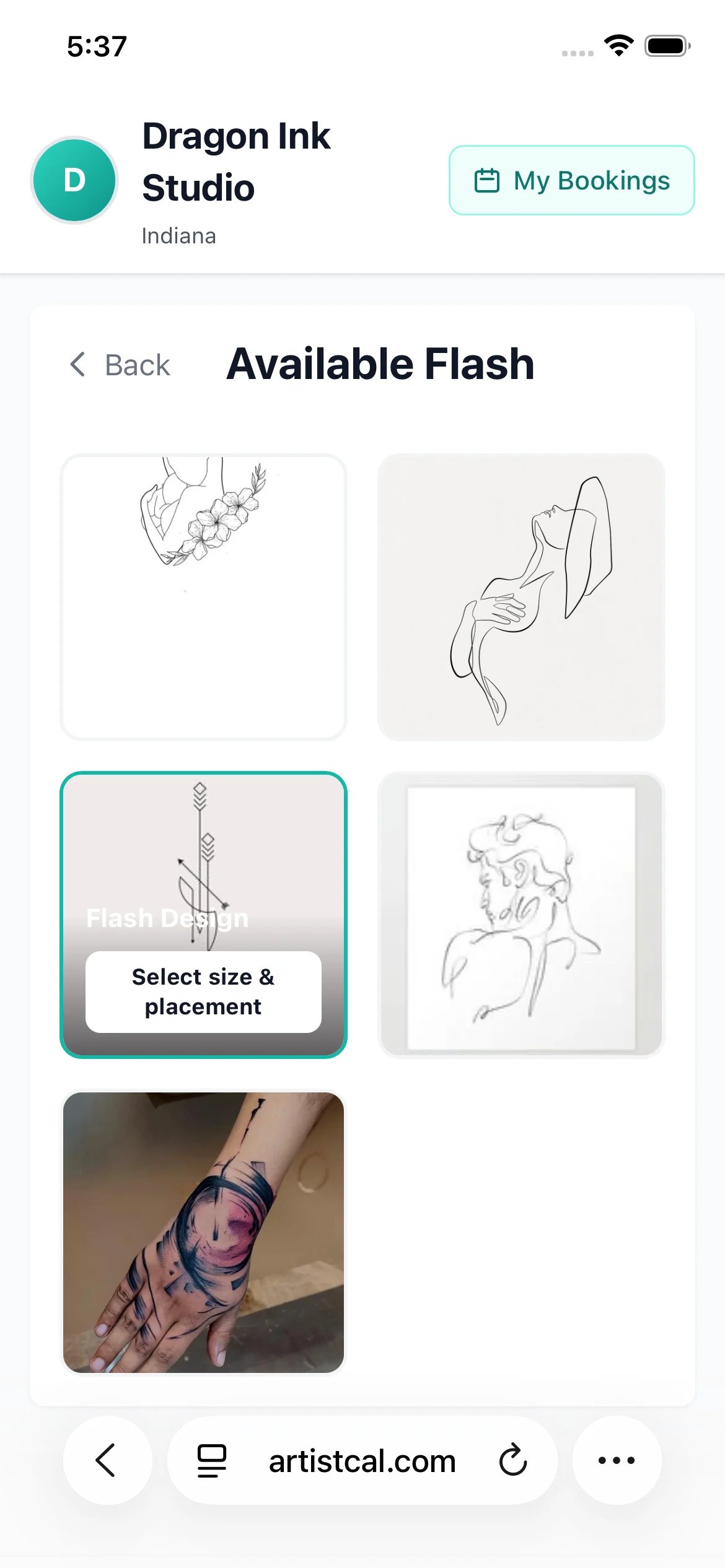 Browse your flash > pick size and placement > choose date and time > enter details > Sign consent > Pay > Done.
